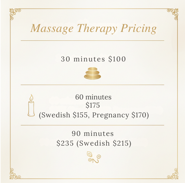 Bespoke massage therapy designed to honor your body’s unique story. We thoughtfully tailor each session, targeting the places where tension has made its home, so you can dissolve completely and let every worry melt away.